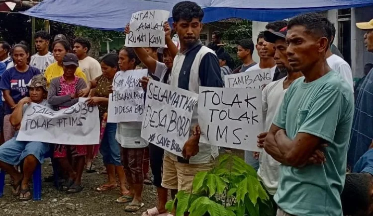 Mereka membawa umbul-umbul bertulisan ‘Kami Menolak Perusahaan Masuk di Desa Bobo, Selamatkan Desa Bobo #SaveBobo, Hutan adalah Rumah Kami, Tolak-Tolak PT IMS, dan Save Bobo: Tolak PT IMS’. Intim Mining Sentosa (IMS) memiliki 49% saham di KTS, yang juga terafiliasi dengan Harita.
